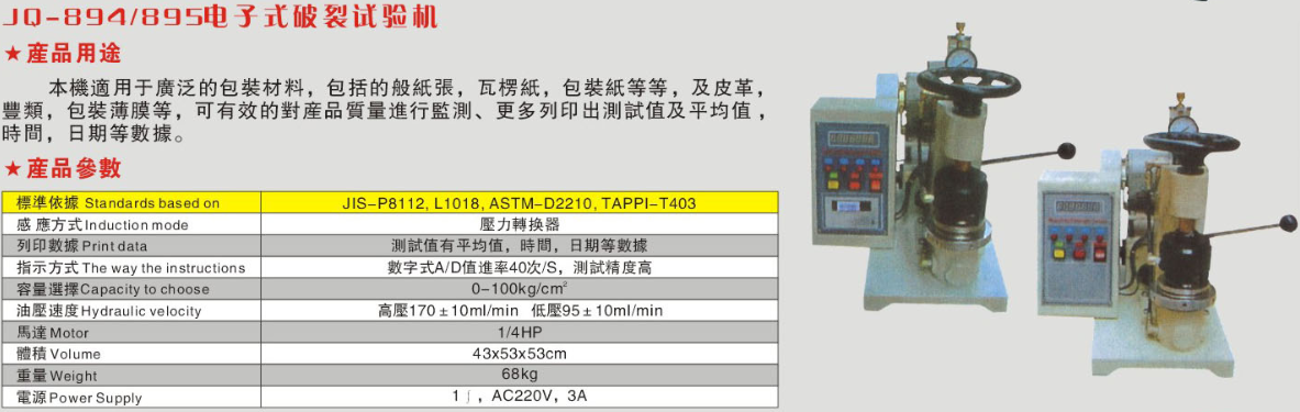 本儀器之設(shè)計符合ISO2759《紙板耐破度的測定》和GB/T1539《紙板的測定法》之標準要求。適用于以瓦楞紙包裝之制鞋、電子、電線、電器、五金、自行車、手提包、食品、家具等工廠,檢驗紙箱之抗破裂強度。亦可測試成皮﹑布類。采用訊號傳輸壓力,試料破裂時自動保留最大破裂強度值。