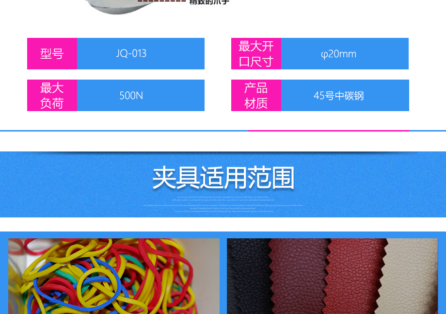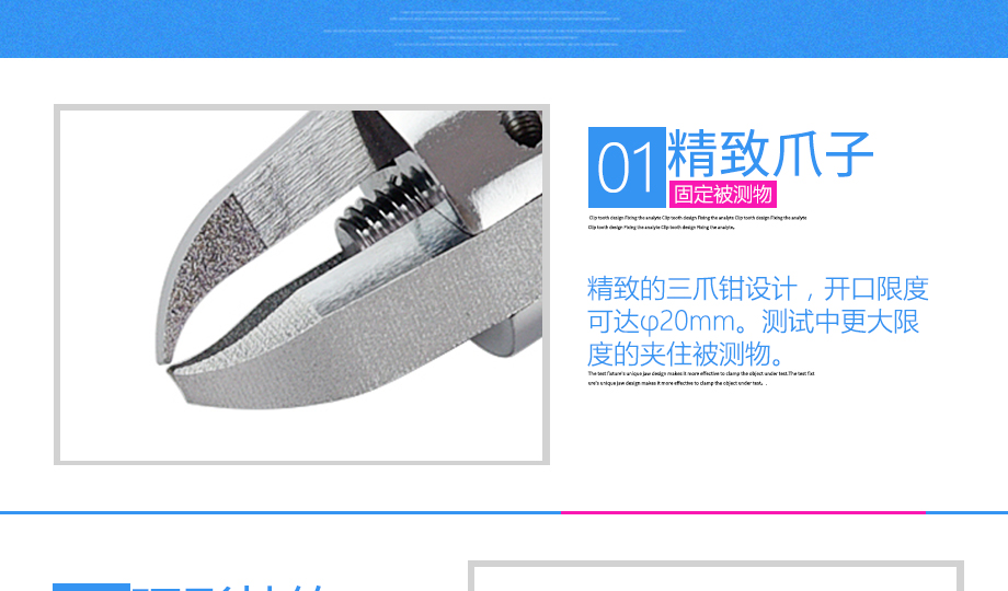 產(chǎn)品型號(hào):JQ-013 品牌:劍 喬 用途:三爪鉗夾具適用范圍:橡膠、各種線纜、紙、各種電器元件、塑料薄膜等材料的拉力,破壞力測試。