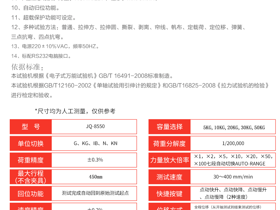 產品型號:JQ-8550 品牌:劍 喬 用途:本系列機廣泛用于各類薄膜、五金、橡膠料、紡織、建材、絕緣體、電線、電纜、端子等各類材料。測試其拉伸、撕裂、穿刺、剝離、抗壓、彎曲、抗剪切、定荷重、定位移、三點抗折